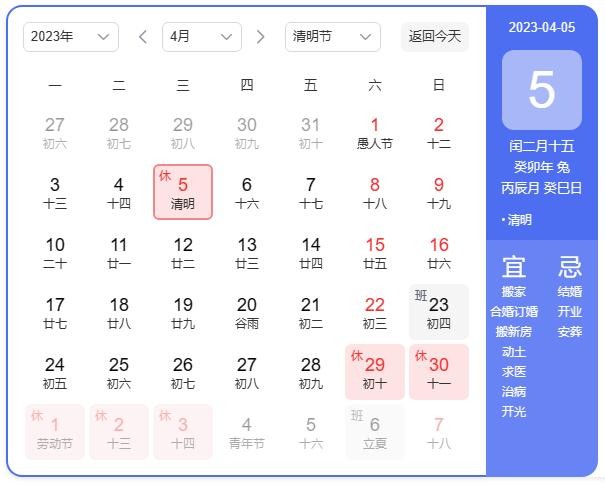 2023年清明节4月5日(星期三),放假1天。4月5日0:00至4月5日24:00,7座及以下小型客车高速公路免费通行。