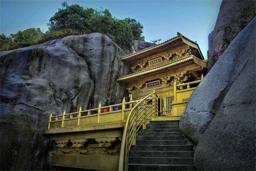 “仙山之中有仙居”,曾火遍ins的金色悬空铜殿就在这里。太姥山这座铜殿,在幽谷山崖中崛起,悬浮半壁;殿内的佛相庄严肃穆、庭前的铜狮威雄灵动,构筑了一处风景旖旎,清净幽致的佛教胜景。