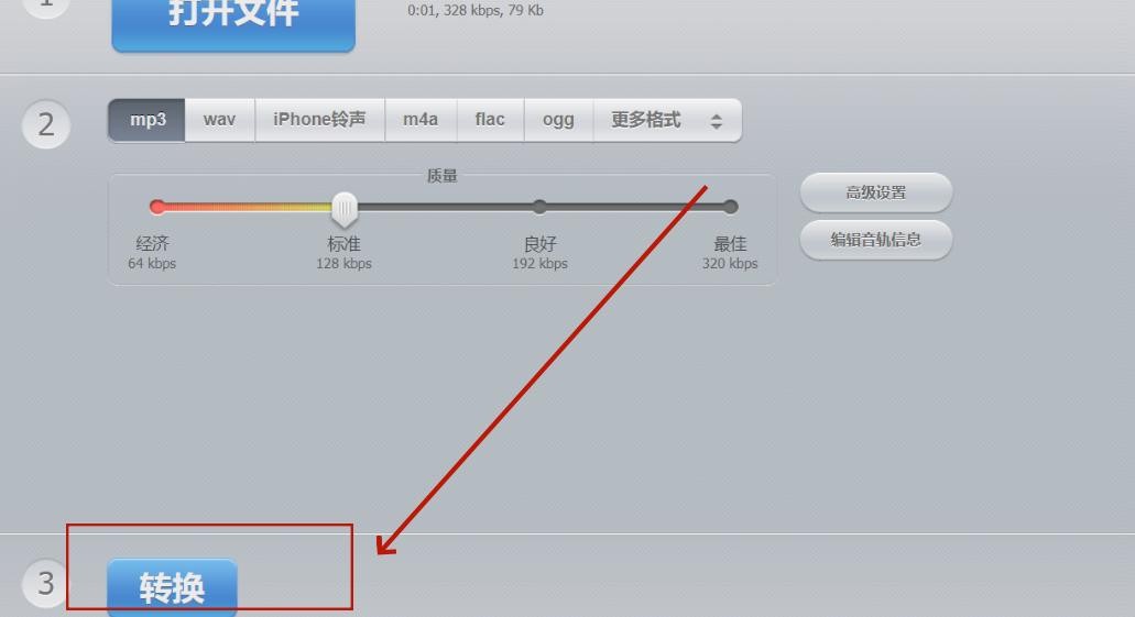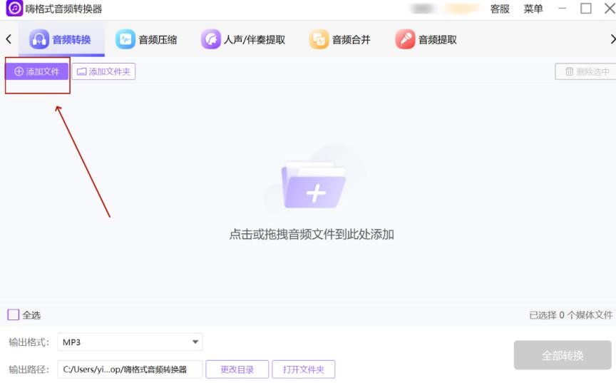 步骤2,选择“打开文件”,将音频上传到转换器中,把输出格式设置为“mp3”。