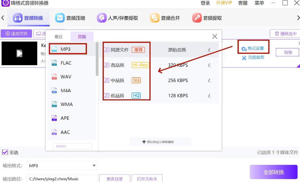步骤2,将输出格式设置为“mp3”,并选择相应的参数,这里推荐选择原始音质。