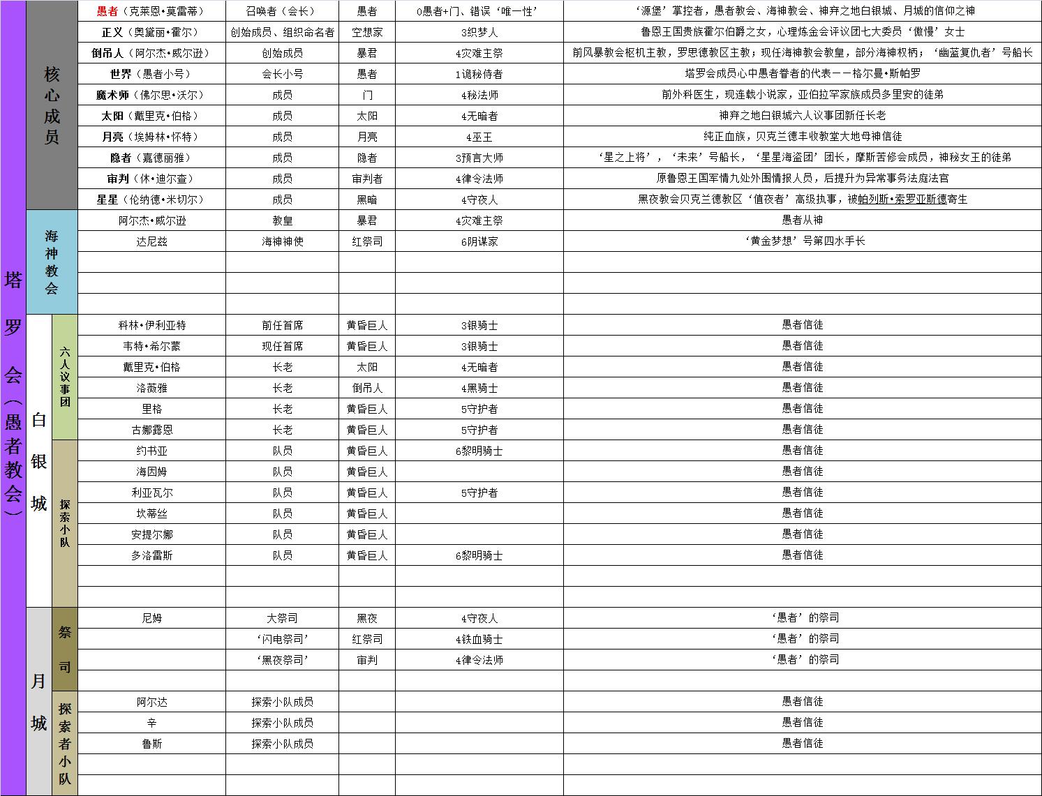 除了这个序列图之外,我还抽空统计了愚者的势力范畴,也就是愚者教会的主要成员,其中包含:塔罗会、海神教会、白银城、月城这4大构成势力,他们被统称为【愚者教会】