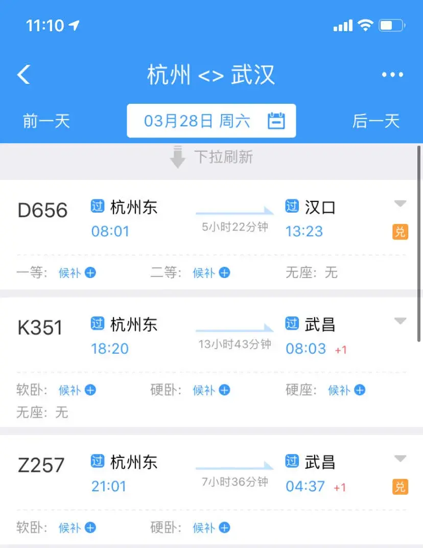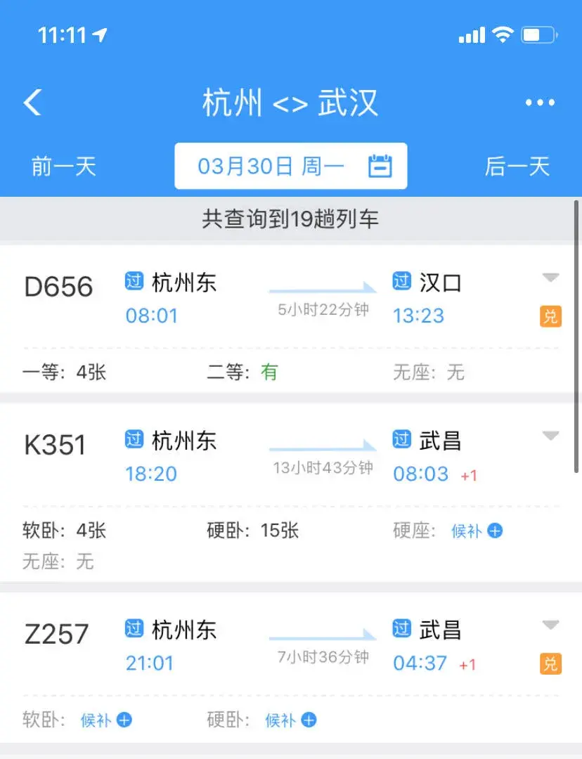 如:3月25日杭州前往襄阳、恩施、黄石的软卧、硬卧、硬座均有余票在售。