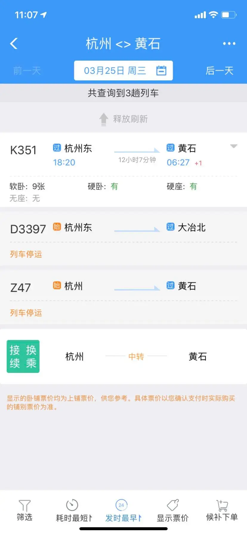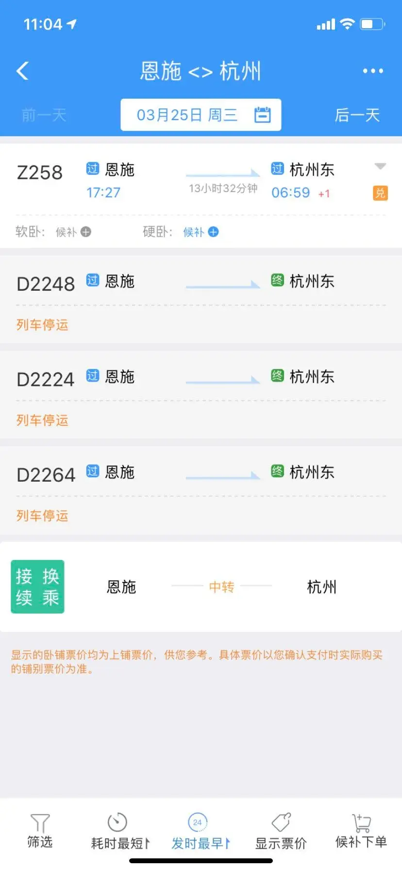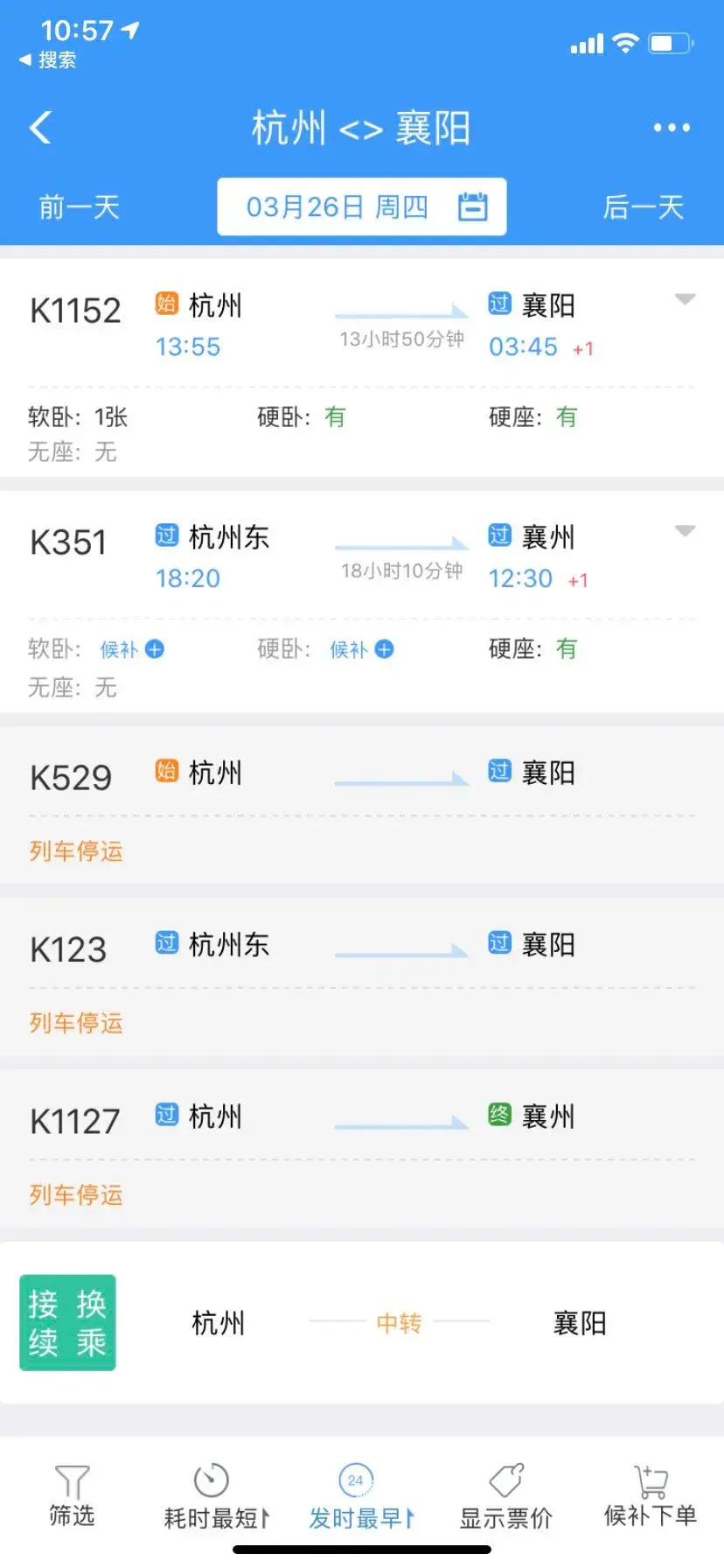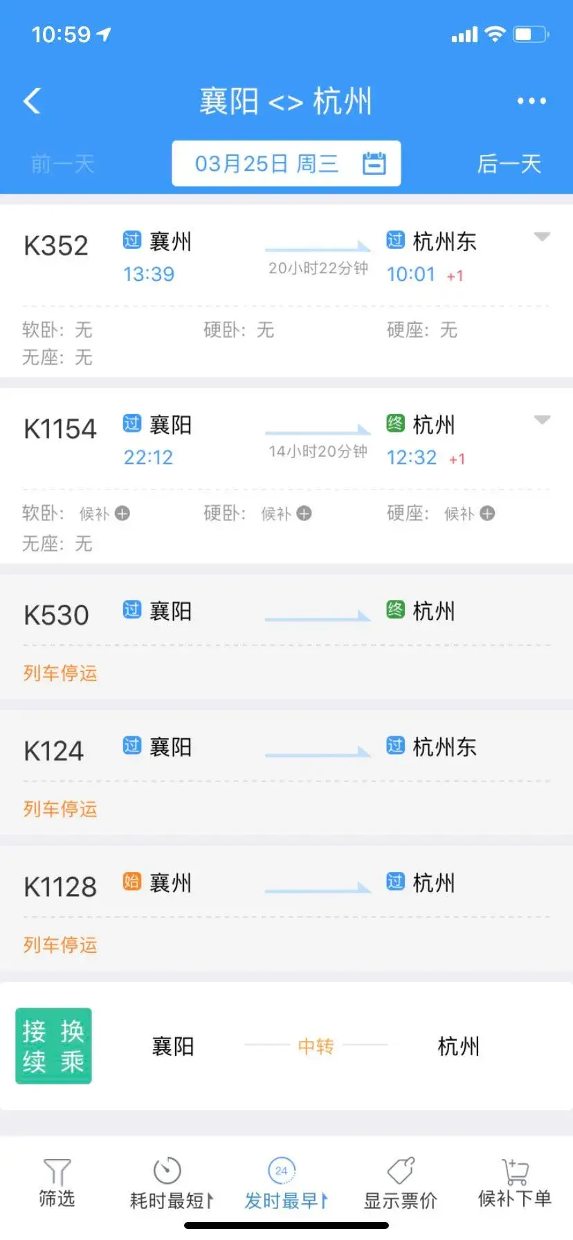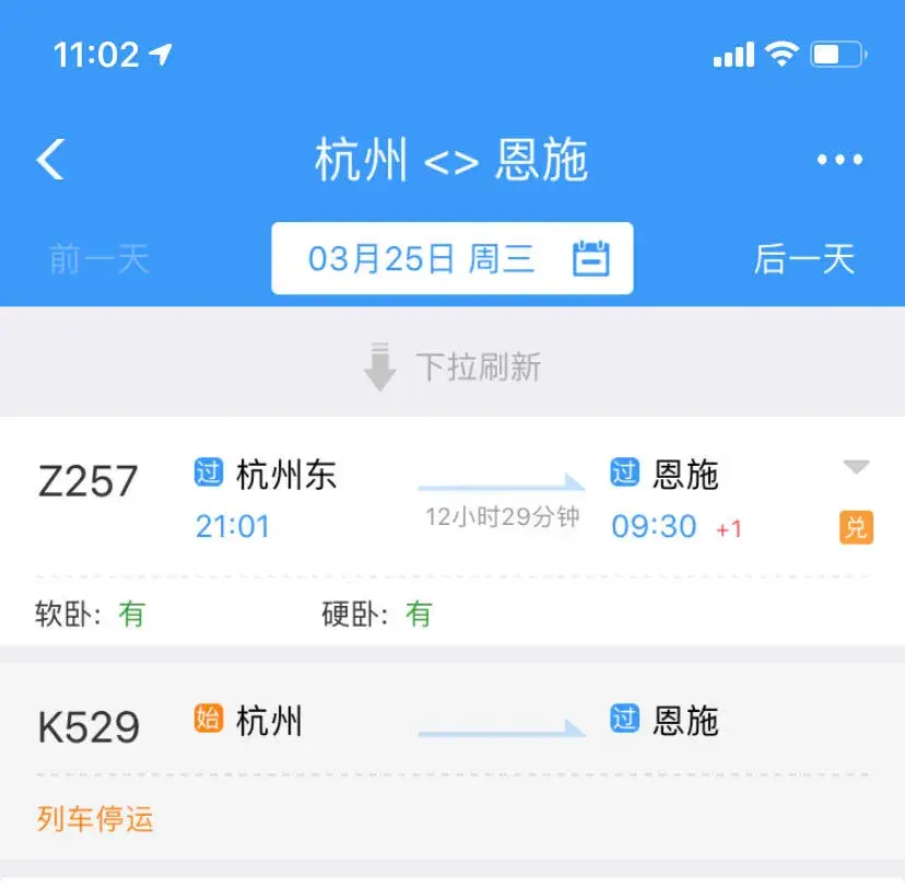 3月25日襄阳前往杭州的K352次、K1154次,恩施前往杭州的Z258次均有票可买。
