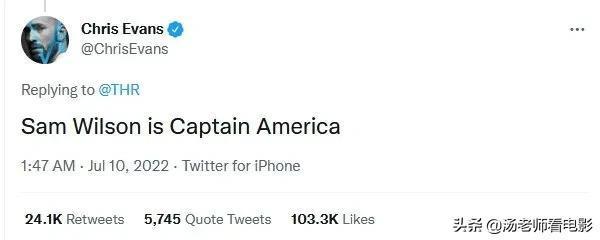近日“美国队长”克里斯•埃文斯就网友热议“美国队长”换人一事在THR的报道推文下留言回应:“山姆·威尔逊是美国队长”而这也和《复仇者联盟4》中结尾处老去的罗杰斯对山姆表达希望他可以接过美国队长重担也不谋而合。