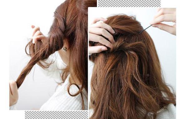 step 3 将发辫绕向脑后,横向固定在步骤一的发束扭转处下方。