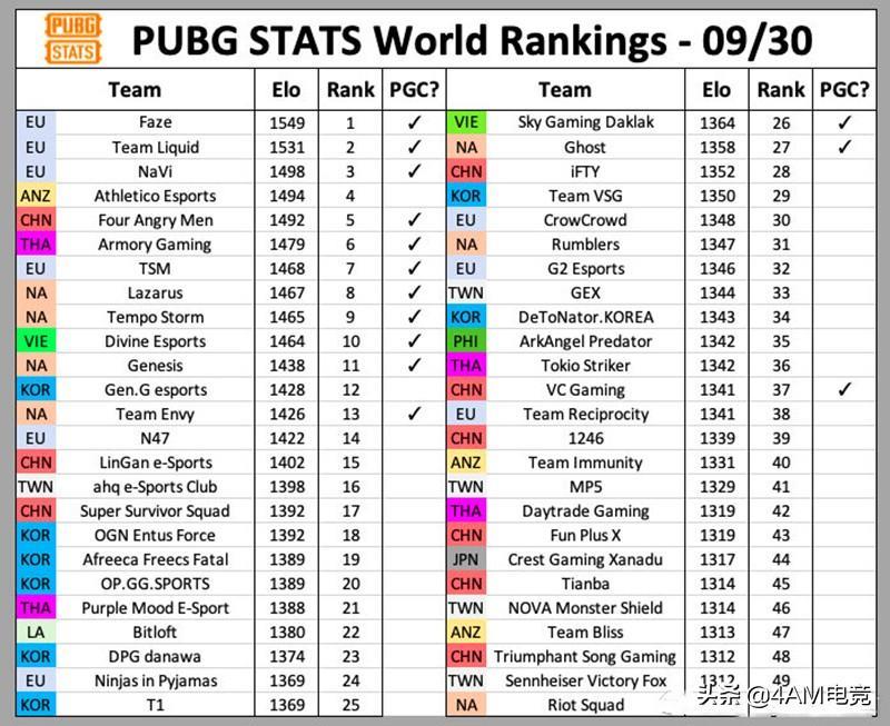 绝地求生战队全球排名出炉,4AM国内第1世界第5,OMG意外落榜