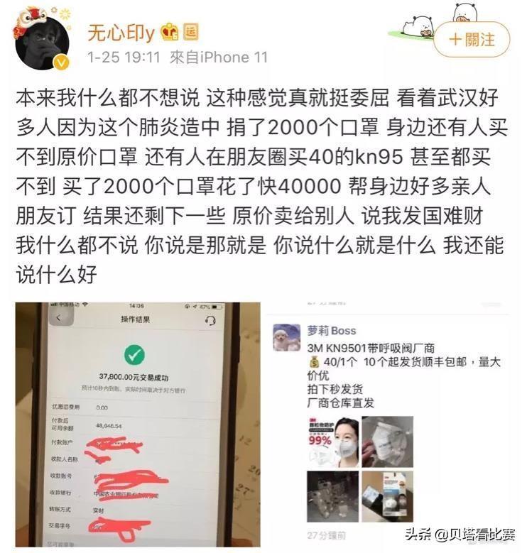 无心印在微博上表示,自己买了2100个口罩花了快40000块,有2000个捐了,因为看到有人卖40一个,才想着把剩下的原价卖给粉丝的,没想到这都有人不开心?