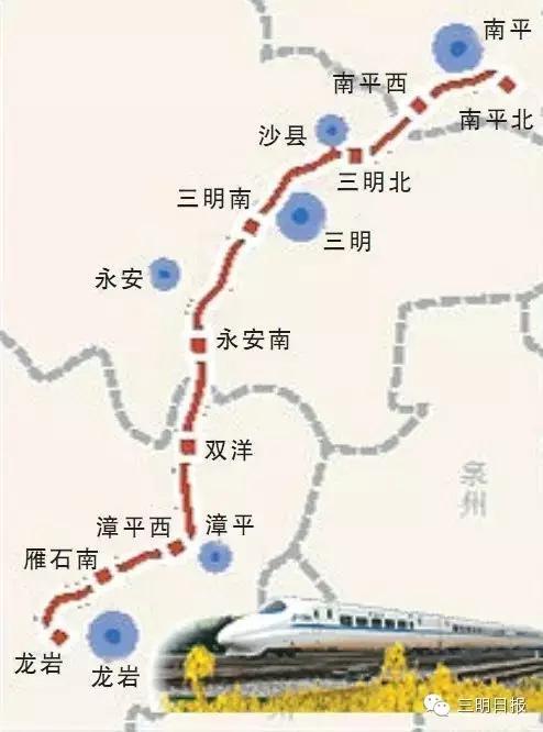 南三龙铁路北起在建的合福铁路南平北站,南至赣龙铁路龙岩站,正线长度246.55公里,总投资251亿元,设计行车速度200公里/小时,途经南平、三明、龙岩3个设区市,预计2017年年底完工。三明境内经过沙县、梅列、三元、永安4个县(市、区)。