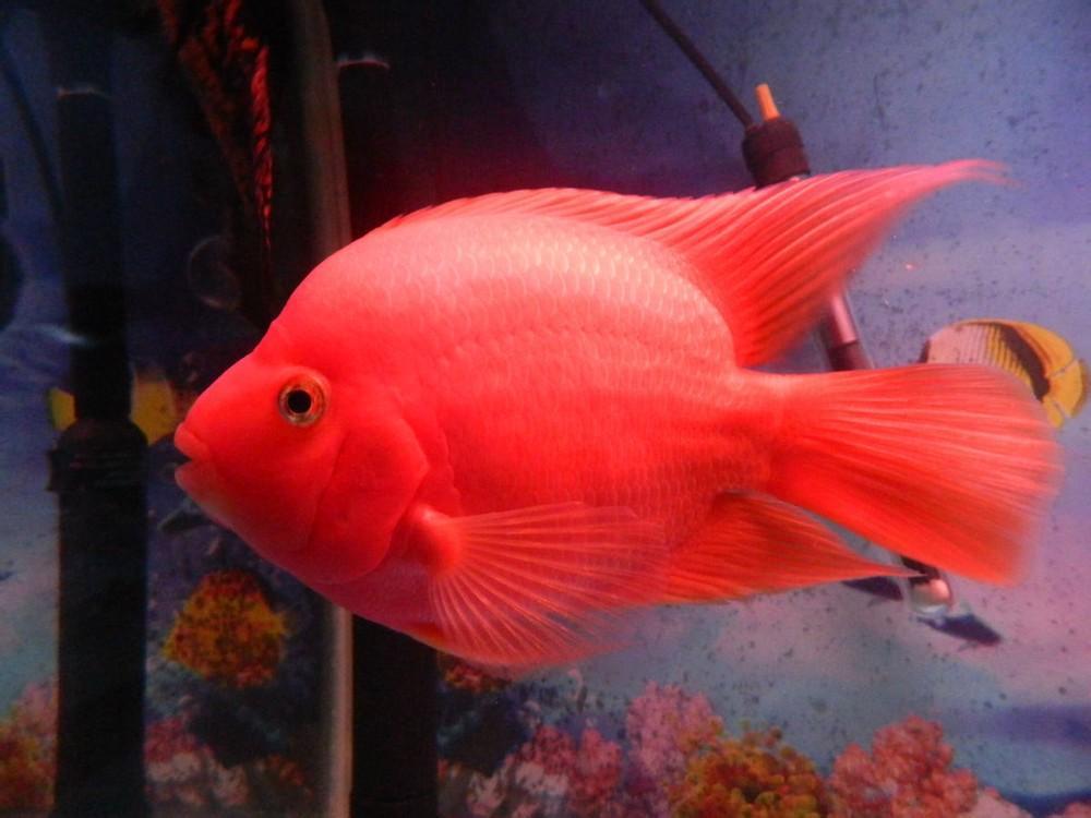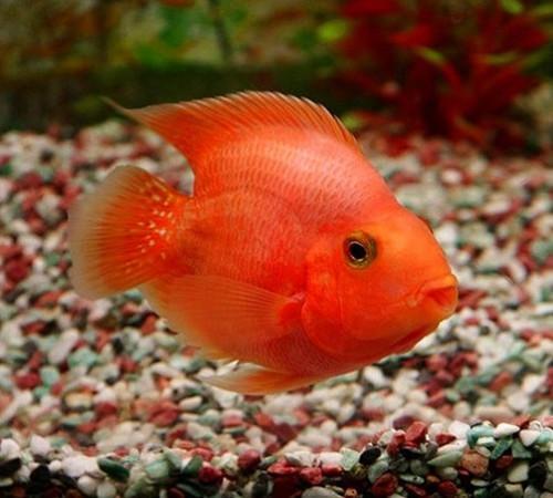 鹦鹉鱼是在热带海洋的珊瑚礁中生活的一种色彩鲜艳的热带鱼,它们身上有美丽的斑谰色彩,就像鹦鹉五彩的外衣,是观赏价值很高的一种鱼类。其体形近似球形或卵圆形,背圆、尾鳍发达,全身几乎血红色,长著可爱的三角嘴,总是笑不合口, 因此深受鱼迷们喜爱。