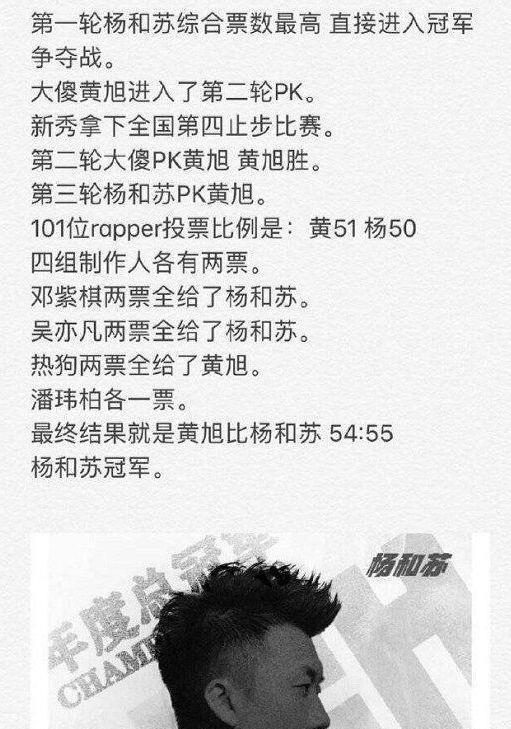 相信这两天关注《中国新说唱》的朋友应该都知道,这档耗时几个月的大型音乐节目最终还是在前天落下了帷幕,来自活死人厂牌的rapper杨和苏在经过一系列苦战后最终夺得全国总冠军,而作为第一季有嘻哈的老将黄旭在总决赛上以极小的票数差距惜败,最终只能屈居第二。