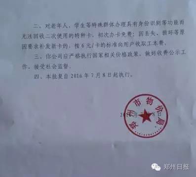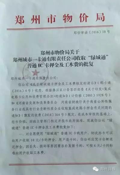 ↑郑州市物价局关于绿城通卡押金及工本费的正式批文