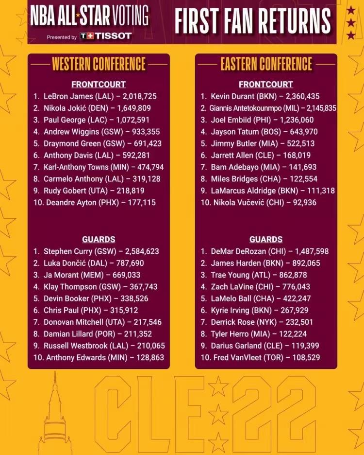 东部后场排名:1.德罗赞,2.哈登,3.特雷杨,4.拉文,5.三球鲍尔,6.拉文,7.罗斯,8.希罗,9.加兰德,10.范弗利特。从截至目前的整体投票情况来看,目前库里得票数为2584623票暂时领跑票王位置,紧随其后的是2360435票的杜兰特和2145835的字母哥,而上赛季的票王詹姆斯目前得票数为2018725,在总得票排行榜中仅排名第四。本赛季已经37岁的詹姆斯发挥依然出色,但湖人队战绩不佳,是他首轮得票不够高的主要原因。但投票才刚刚开始,以詹姆斯的影响力,他还是很有希望和前三名缩小差距。