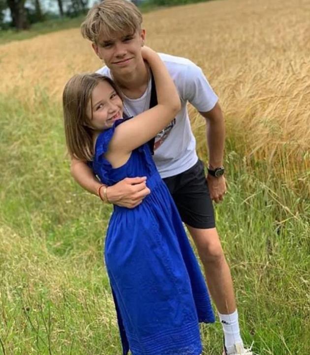 罗密欧的配图是他和小七搂在一起的照片,可爱的小七穿着一件宝蓝色的棉麻蕾丝连衣裙,她搂住哥哥的脖子,罗密欧弯下腰抱住妹妹,在麦田里,兄妹二人甜蜜微笑。