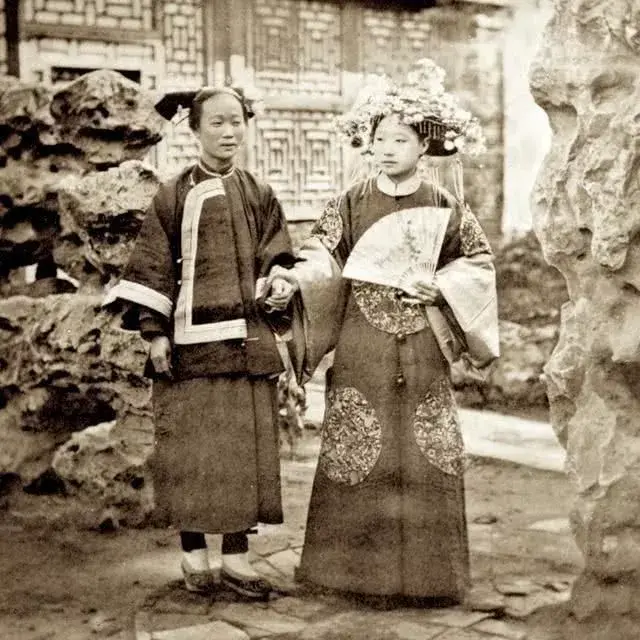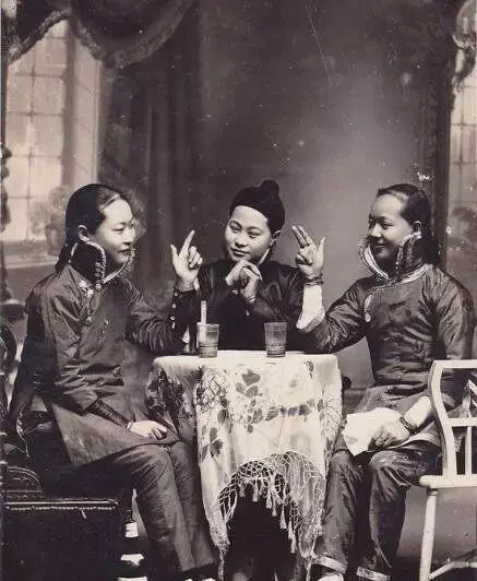 晚清时期三位富家女子,在清末民国时期的老照片中,人物影像往往都是很呆板的,这张照片三位女子对着镜头摆了个非常时髦的手势,有种穿越的感觉