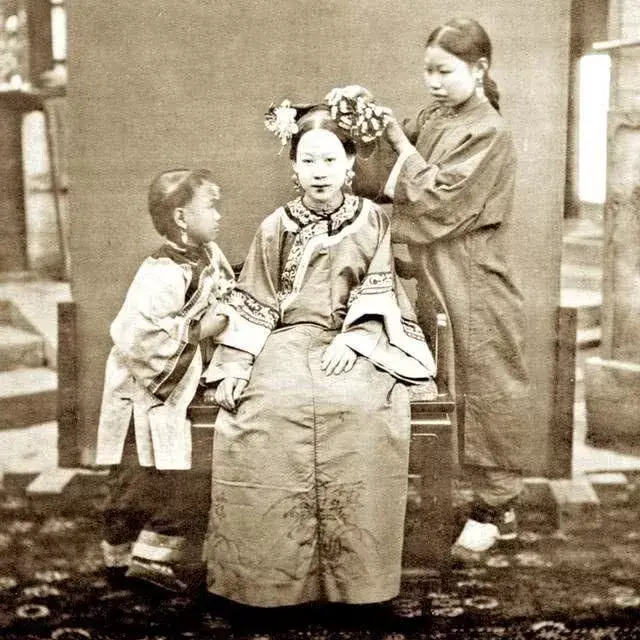 晚清一位大户人家的夫人,旁边丫鬟正在给她梳妆。