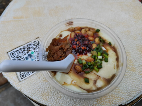 有卖豆腐脑的,六元一碗还不贵,佐料齐全味道不错。