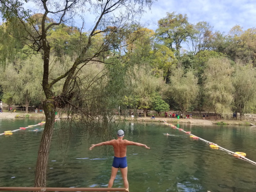 右侧湿地公园湖边有人穿着短裤做热身运动,冰凉的湖水中人和野鸭结伴凫水,哇!第一次看冬游,真佩服他们有强壮的身体。