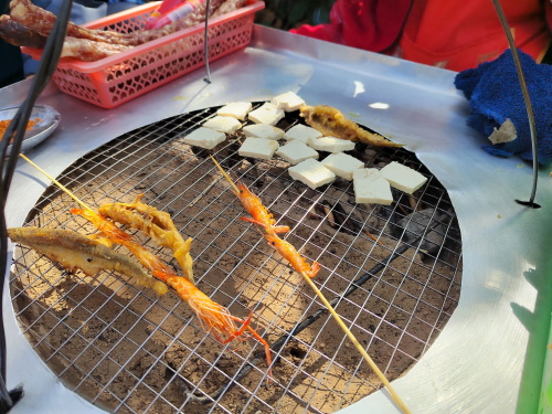 前方还有摆摊的,俩人点了花溪河野生鱼和小虾,又现烤小豆腐,蘸︎辣椒面吃,坐在路边享受烟火气息。