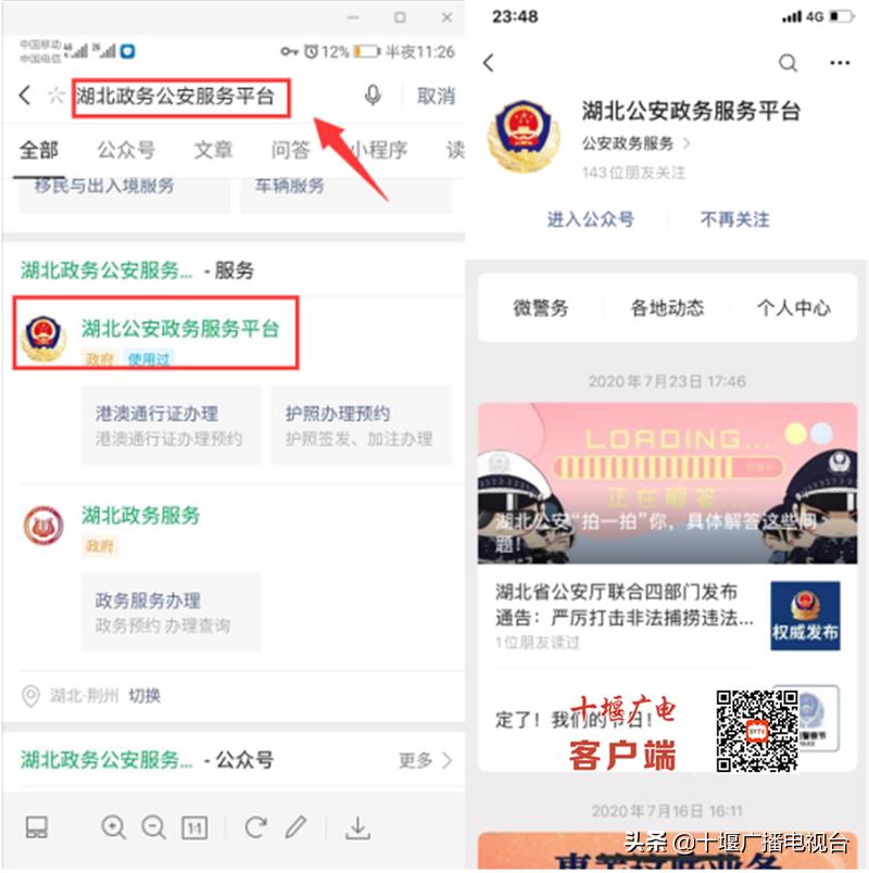 1、用手机打开微信搜索“湖北公安政务服务平台”公众号,并关注公众号;