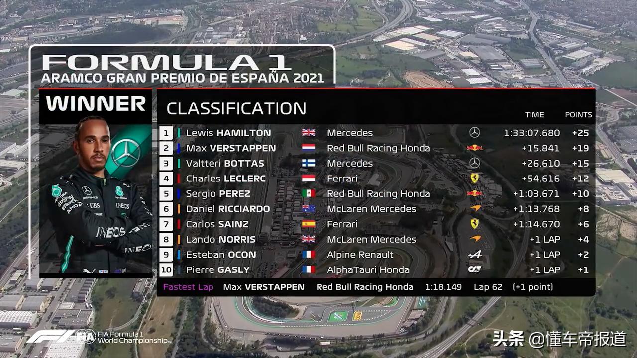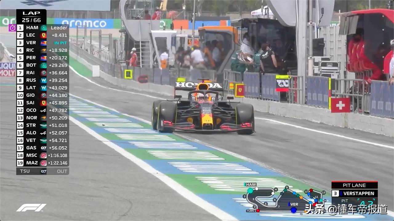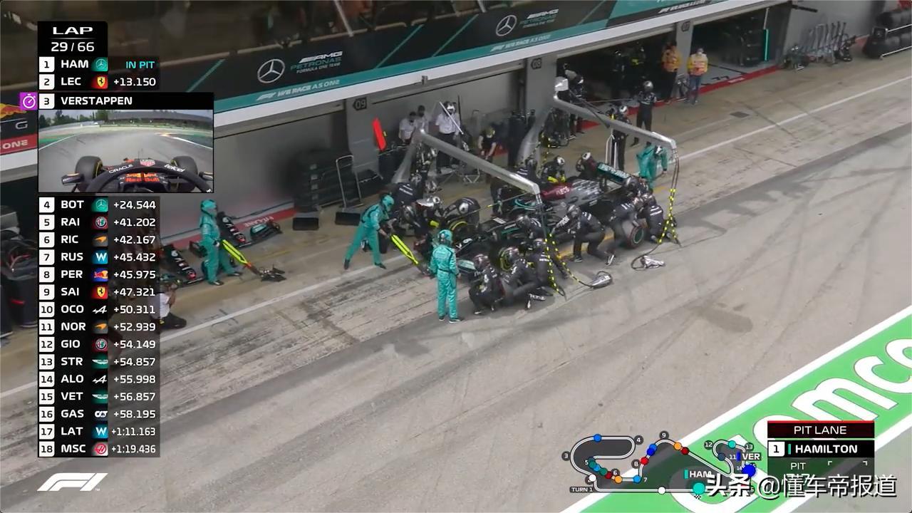 [懂车帝原创 产品] 近日,世界一级方程式锦标赛(以下简称为F1)结束了西班牙分站的较量。比赛中,梅赛德斯车队的刘易斯·汉密尔顿(Lewis Hamilton)与红牛车队的马克思·维斯塔潘(Max Verstappen)在进站策略上稍有差异,最终汉密尔顿获得了他的第98个车手冠军。