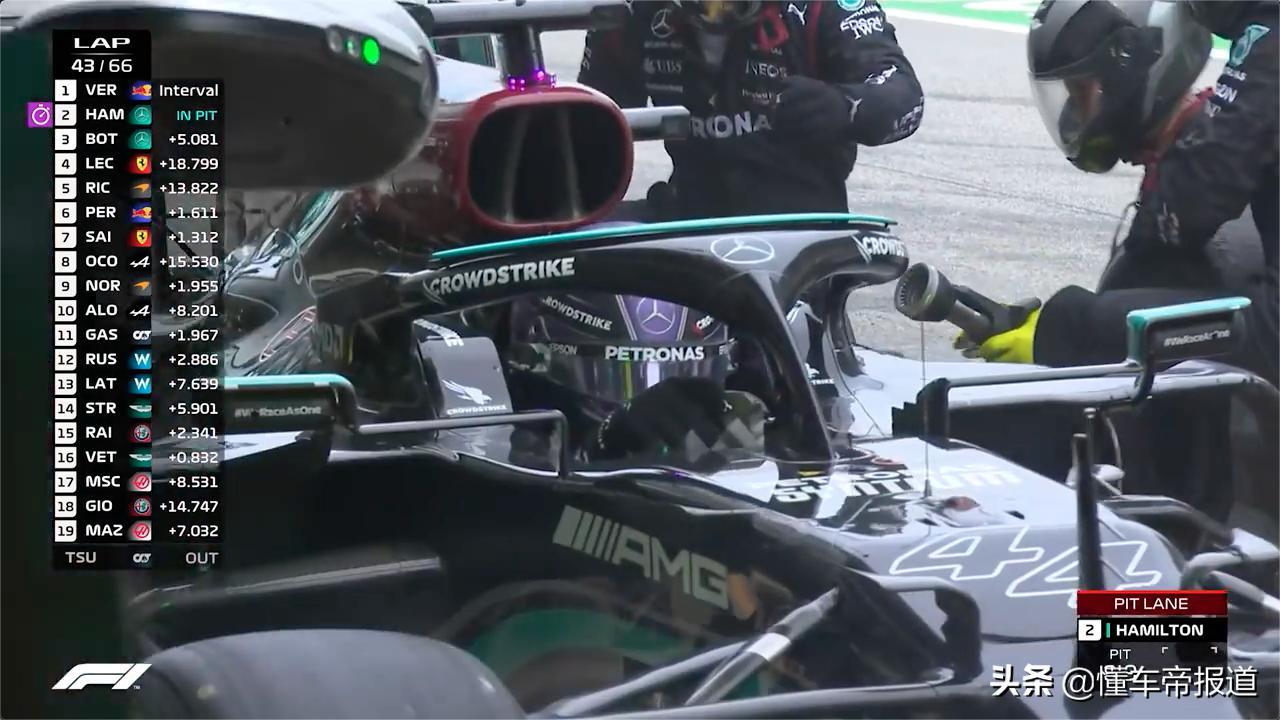 当赛程来到第42圈结束时,汉密尔顿突然进入维修区,并换上了一组中性旧胎。当驶出维修区时,汉密尔顿排在队友博塔斯之后,落后处在第一位的维斯塔潘23秒。不过,此时红牛车队并没有制定“两停”的进站策略,但车队希望维斯塔潘在顾及轮胎磨损的同时,继续保持高圈速的状态,以确保领先地位。