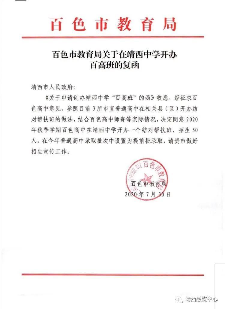 为进一步提升教育教学质量,充分开发、利用、共享市直百色高中优质教育资源,促进均衡发展,在与百色高中深入对接沟通后,靖西中学与百色高中从今年秋季学期开始,每年联合开办“靖中百高班”。