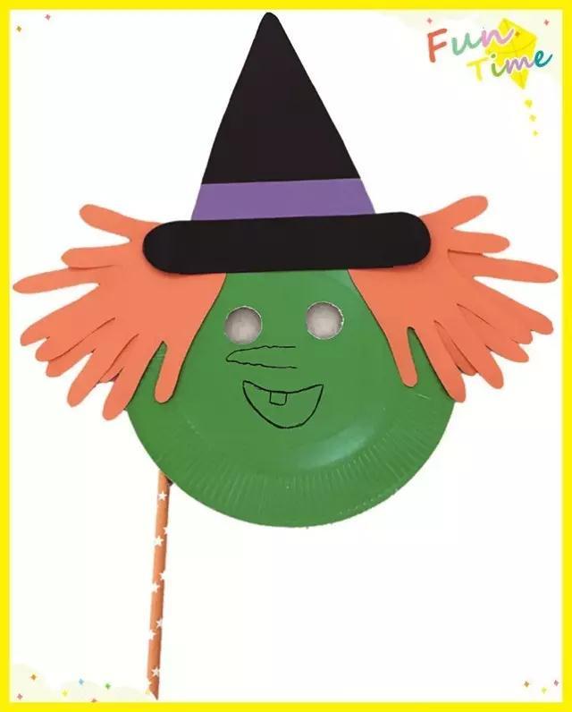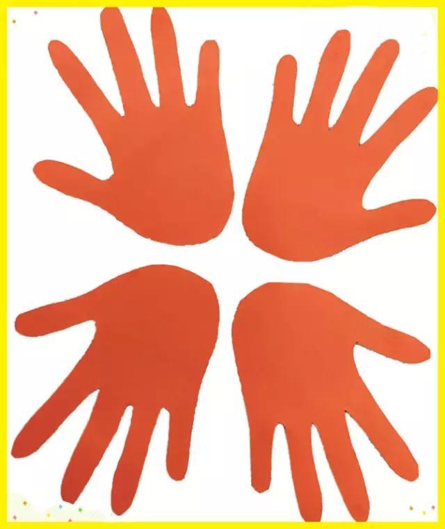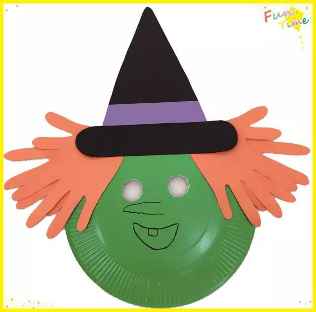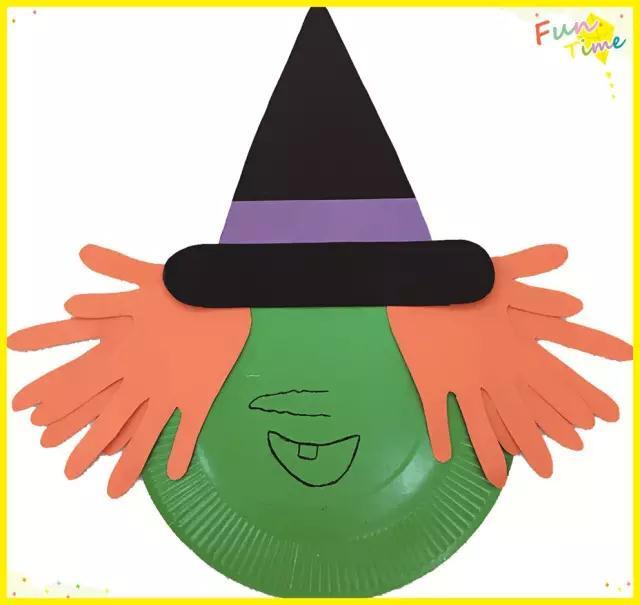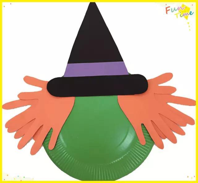 制作步骤:在橘色卡纸上描出四个手印,并剪下来。这些就是女巫的头发。