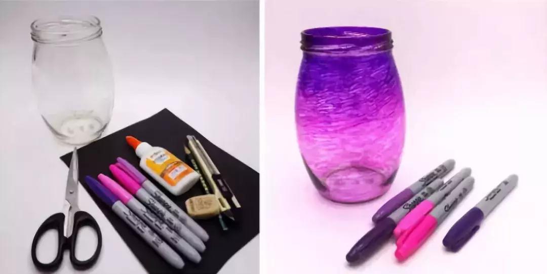 准备材料:玻璃瓶、粉紫色油性笔、黑色纸、胶水、铅笔、剪刀。