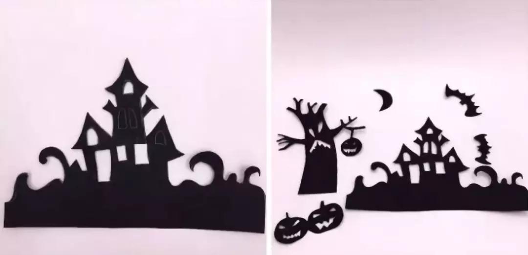 铅笔在黑色纸上画出城堡、树、蝙蝠、南瓜等万圣元素,用剪刀剪下。