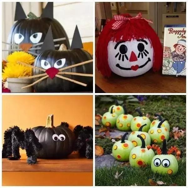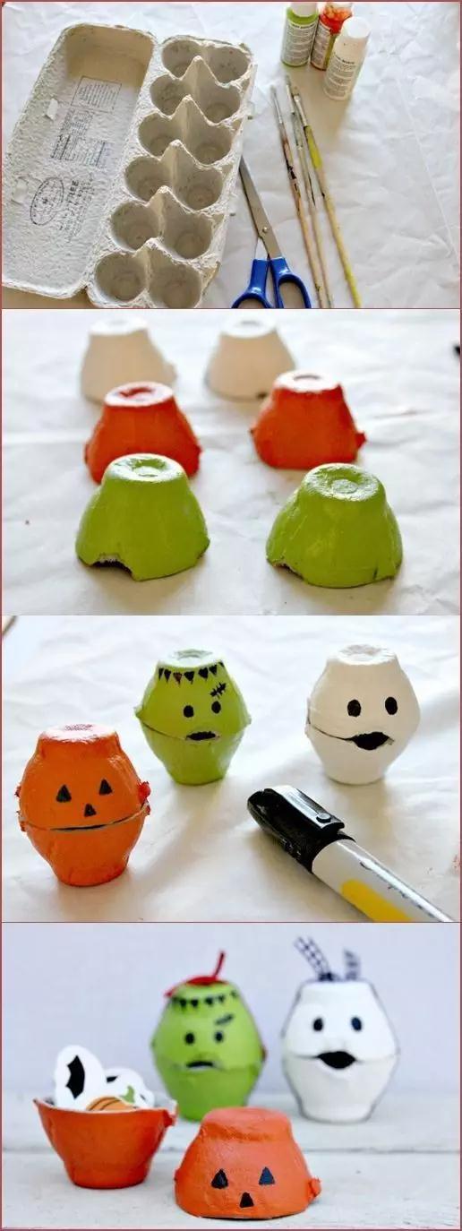 用剪刀将蛋壳包装分别剪开,小心地涂上自己喜欢的颜色。然后用Mark笔画一些圆圈或三角(表示幽灵的眼睛),鸡蛋包装的自然缺口则可以当嘴巴(这个结合自然缺损的创意实在是太巧妙啦!)一只只呆萌又可爱的小幽灵就出现啦!