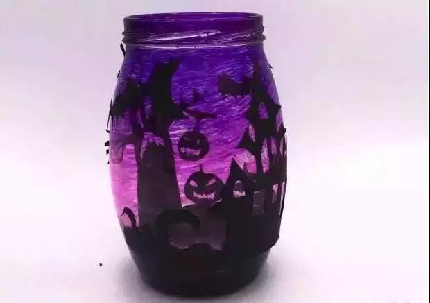 将剪好的元素贴在瓶身,再放入一只蜡烛。古怪的剪影,神秘的色彩,映透着稀疏的烛光,点亮了奇妙的万圣夜。