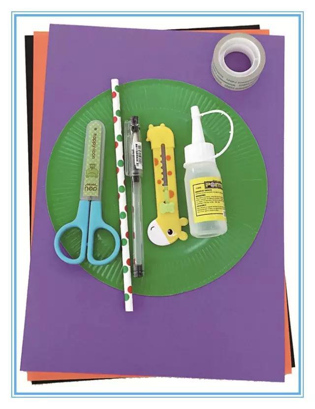 准备材料:紫色卡纸、黑色卡纸、橘色卡纸、绿色纸盘、笔、裁纸刀、胶水、剪刀、胶带、吸管。