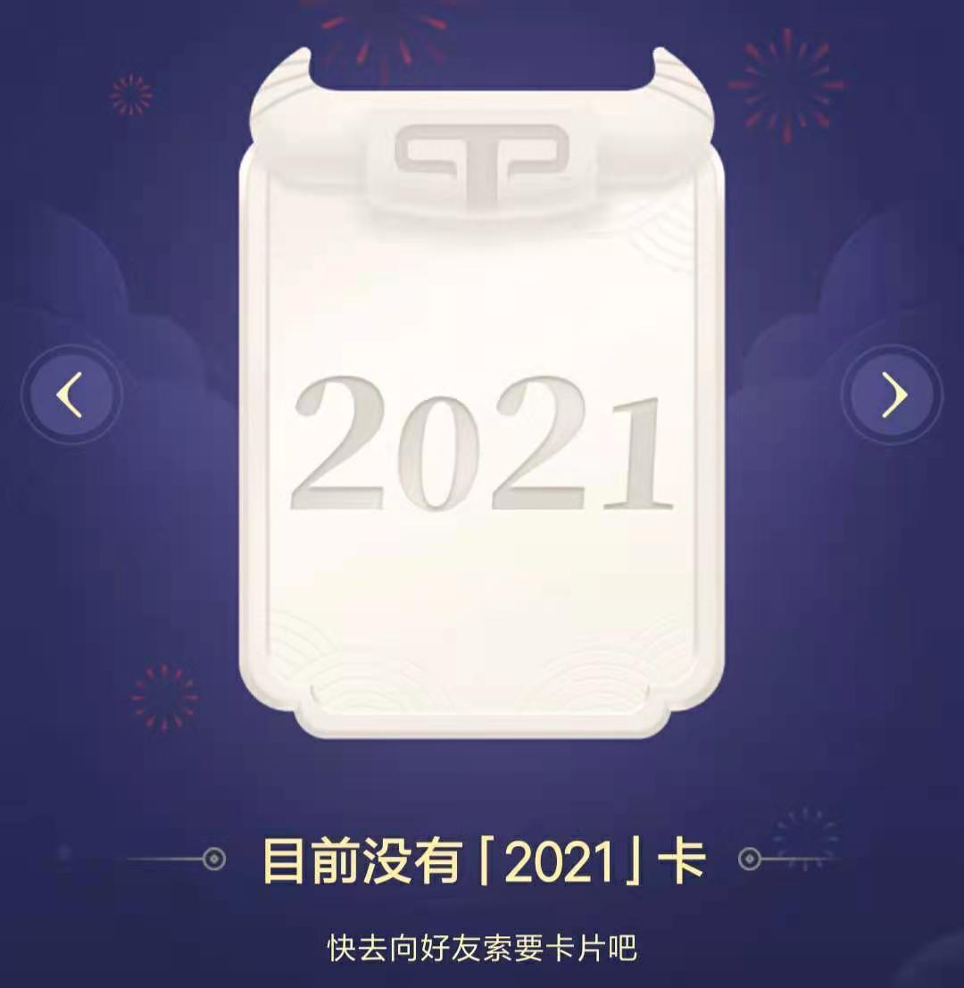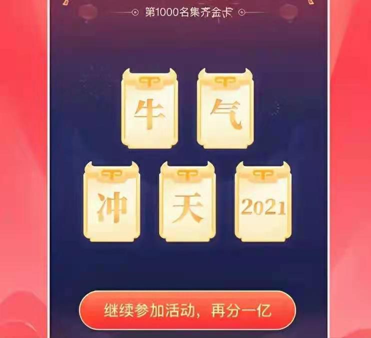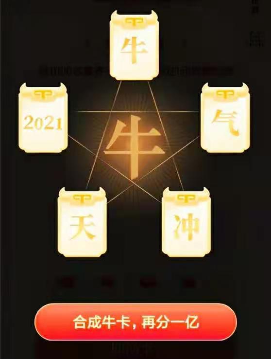 随着除夕之日的越来越近,相信大部分人都已经集齐了“牛、气、冲、天”这四张金卡,因为这四张金卡太容易获取了(只要随便做下任务就能翻到)。但是还是有很多集卡开始很晚的朋友们缺这张“2021”这张卡。其实获得“2021”这张金卡也不难,当然单纯做任务抽卡获取有点难度哈。接下来我就从两个方面给大家分析如何获取到更多“2021”金卡,还有就是即使集齐“2021”这张金卡合成后续的“牛”卡,合成牛卡后就有机会在除夕当天获取2021元锦鲤红包(目前已经有910人已经集齐,也就是还有90名幸运儿瓜分这1亿巨额红包),你会是其中的一名幸运儿么?