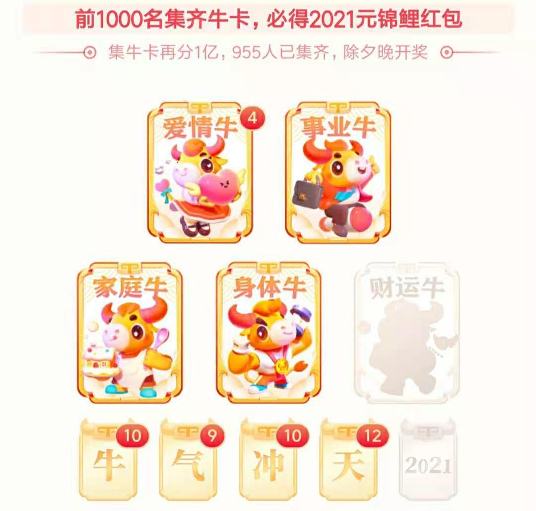 关于如何获取“2021”金卡和集齐五牛卡的攻略就先介绍到这里,希望大家都能把集卡活动当成一种娱乐,不要刻意为之,那集齐肯定会集齐的,只是说时间问题。那这里我祝愿大家新的一年里牛气冲天、锦鲤附体,早日拿到“财运”牛,瓜分这剩下的1亿红包。
