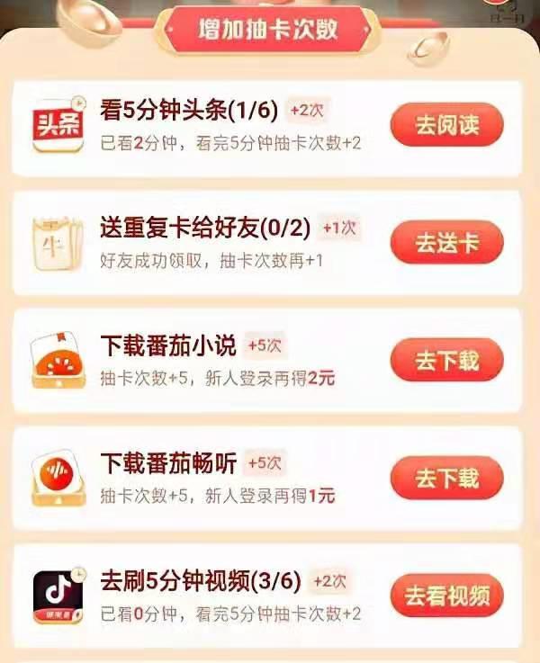 1、通过做任务获取抽卡机会:以这种方法获取“2021”金卡的朋友们,估计等了5天以上才偶然获取的一张“2021”这张金卡的,这种方法虽然简单直接,但是获取难度很大,而且概率低。等到你全部集齐时,估计人家早已合成,坐等分钱了。顺便提下我自己如何获取“2021”这张金卡的,我和大家一样也是每天做任务抽卡,直到晚上夜里12点时,偶然抽取一张“2021”这张金卡,然后合成了“家庭牛”,合成之后再抽一次可以继续获取一张牛卡,想必大部分人是这样过来的。