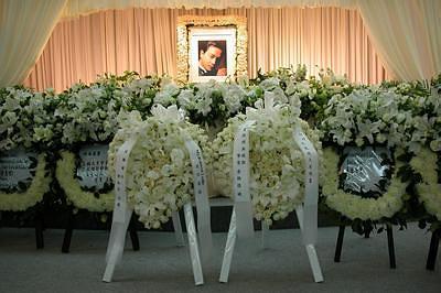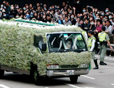 由于前来送行的歌迷众多,为了担心引起混乱,灵车外面覆盖着淡绿的鲜花,后面有一身穿白色警服的交通警骑着摩托车跟随,灵车的挡风玻璃有一张巨幅的张国荣照片,匆匆从等待的歌迷前驶过。