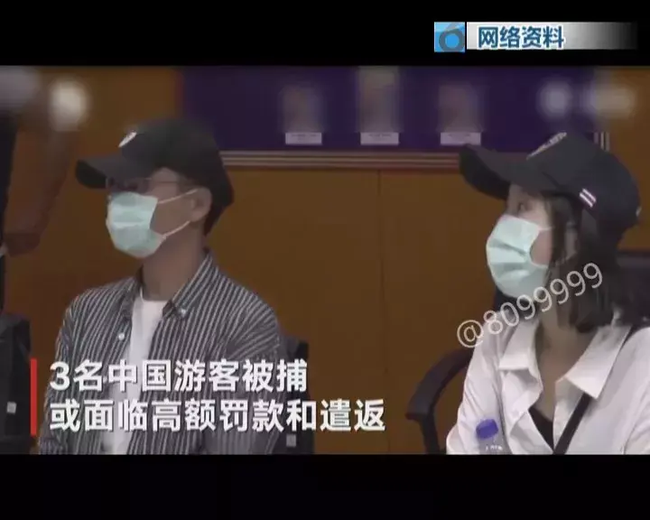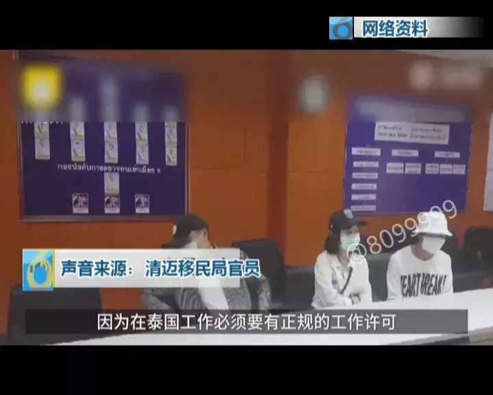 网曝的视频中,3名被捕人员带着口罩,两男一女,正在接受泰国警方问询。