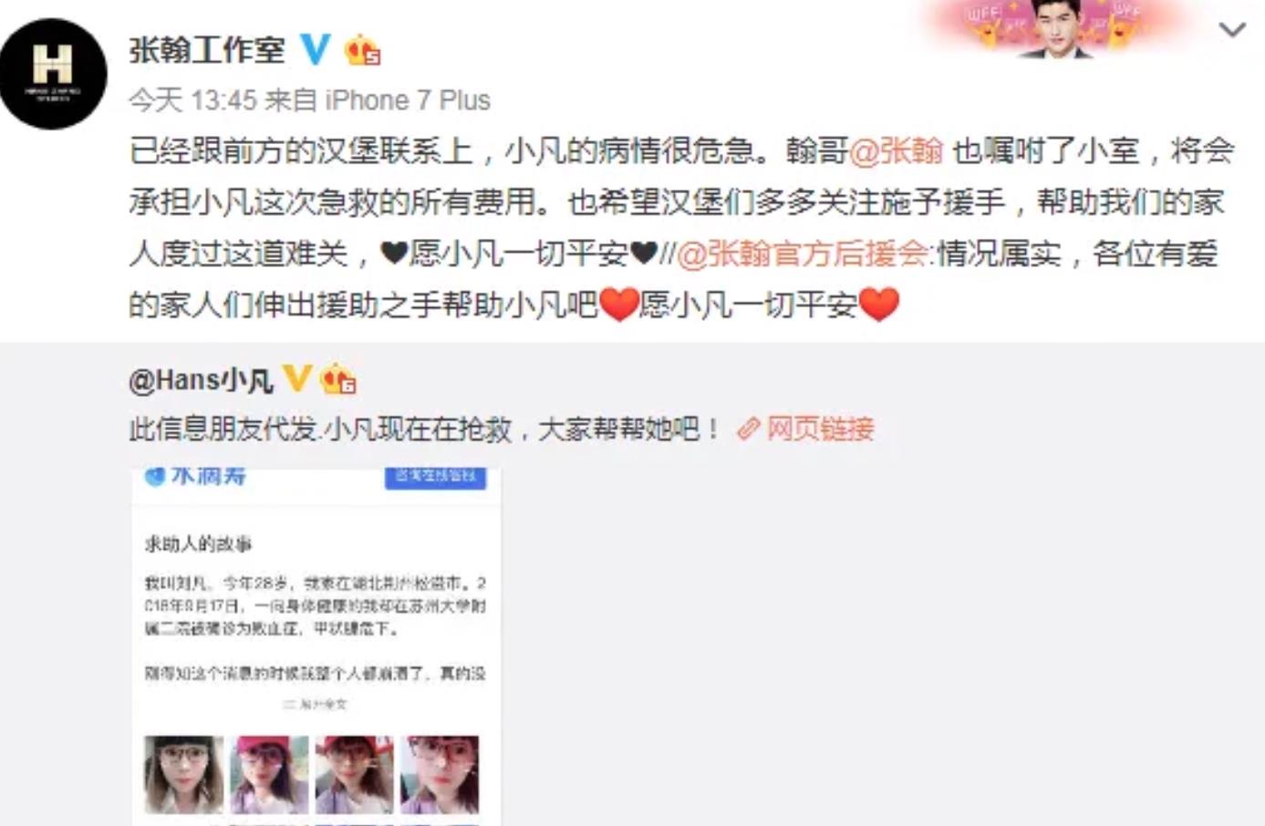 2018年,张翰一位得了败血症的粉丝的朋友在微博发文,称该粉丝正在抢救。