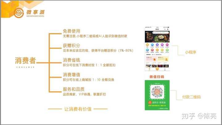 消费者在使用微信派时,无需任何费用,第一次消费买单时会获得0.1元到20元的红包,也就是消费补贴,第二次消费开始会获得1%-80%的积分,每个积分都可以在线上兑换价值十元的产品,与信用卡机构不同的是,信用卡你可能会有几万的积分,但结果只患者价值几十元的东西而已,而我们的积分一个积分就可以兑换十元的产品,还有在线下呢,每一个积分都可以当1元来使用,与传统的商家优惠券不同,当你真正在使用的时候,有可能优惠券会过期,或者是你必须消费500元才能使用这张100元的优惠券,即便你有一张100元的优惠券,商家也不会让你只消费100元,然后用券来抵扣,关键是优惠券还只能在他这里使用。