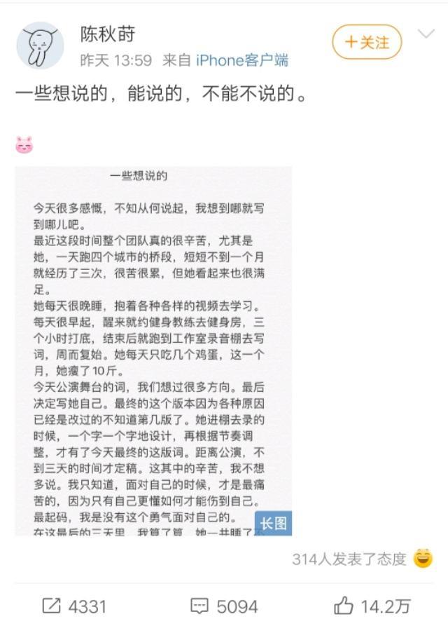 陈秋莳洋洋洒洒几千字,都透露着张靓颖的委屈和不易,也意外暴露了两人同居的事实。在这段长文里,有网友忍不住落泪,真切地感受到了陈秋莳的真情和用心良苦。