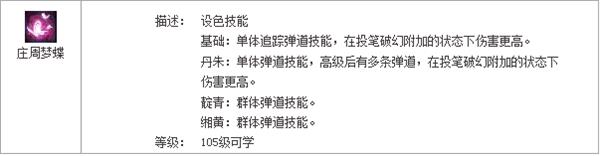 【庄周梦蝶】丹朱(红色),达到41级后就会出现3只蝴蝶,扇形扫荡前方的技能,所谓扇形,就是越接近你的目标最有可能受到3个蝴蝶的攻击,也就是远距离的敌方,只会受到一只蝴蝶的攻击,小青、大二的时候注意角度!