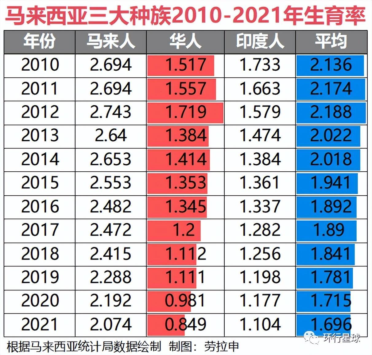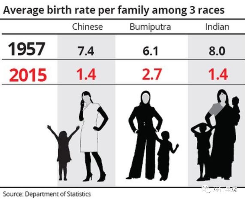 华人出生率也在下降。1957年出生率在三大族群中排位第二,到1995年出生率大幅下滑,是生育率最低的族群。