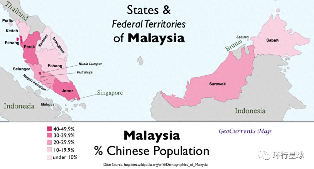 在吉隆坡、槟城、马六甲等城市,大马的华人占比40%以上,其余主要分布在柔佛、霹雳、森美兰、沙捞越等,图:geocurrents▾