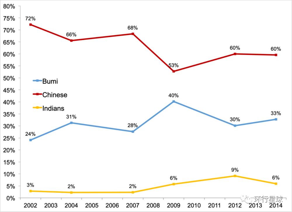 自上世纪70年代实施土著人优先以来,华人在各方面都受到限制,经济地位削弱,财富占比降低。2002~2014年,华人收入涨幅是马国三大族群中最低的。