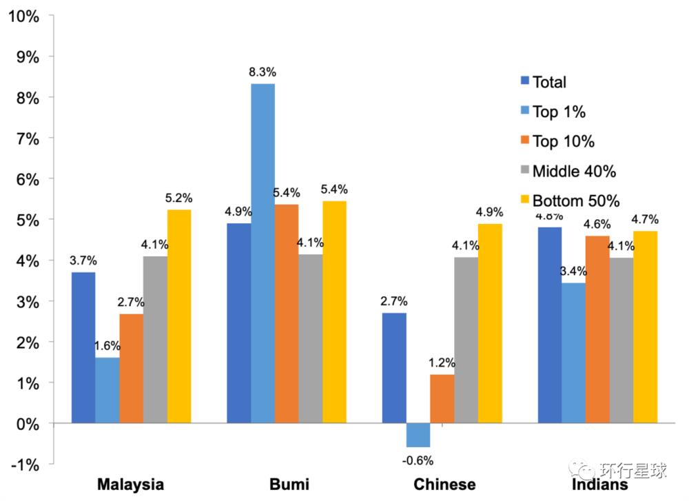 华人高收入群体的收入涨幅下降尤为明显。华人前10%的高收入人群收入涨幅仅1.2%,而马来人是5.4%。在最富裕的1%人口中,华人负增长,马来人高达8.3%,马国政府扶植马来人掌握经济命脉,逐渐剥夺华人财富。