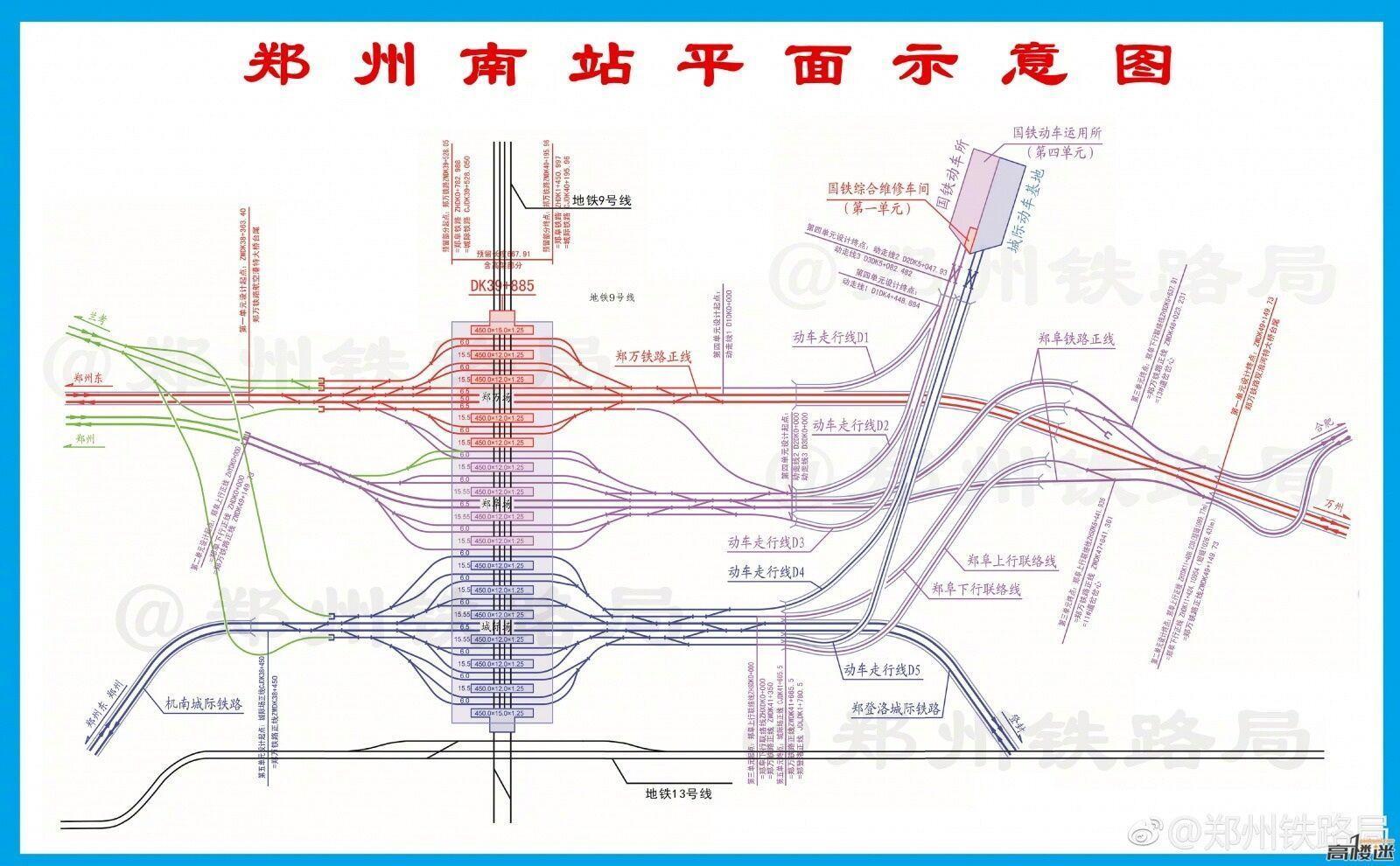 郑州南站(图中左侧为北向),自东向西依次分为三个站场,互联互通,大气!