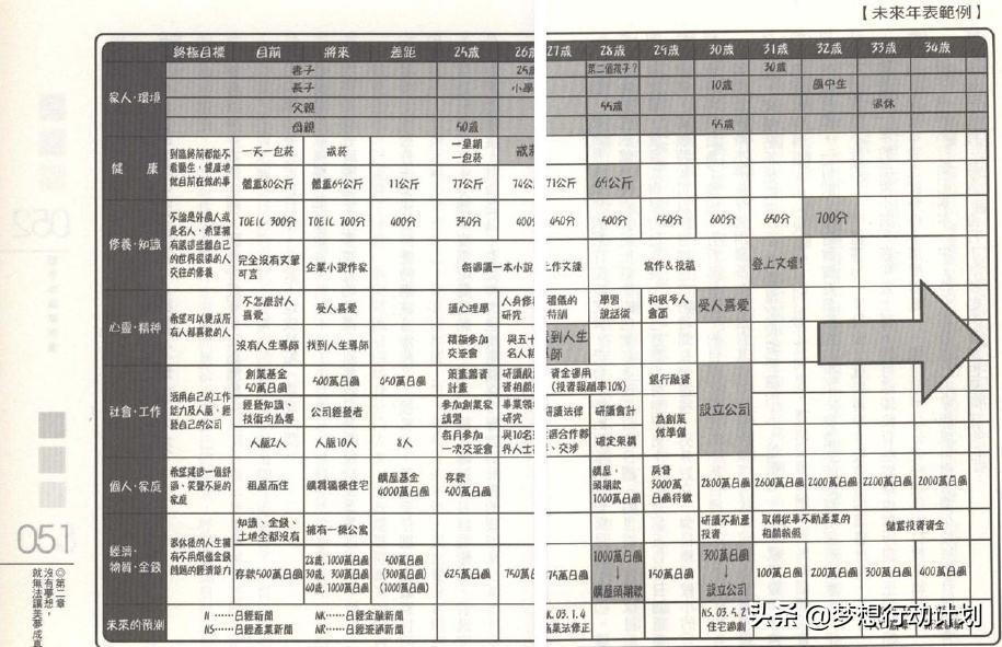 你需要用一个跨页的空间,来做这个10年计划的表格。像书中作者这样的就可以。在表格的最右侧写下10年后的目标,在左边,评估一下你现在的自己,写下自己的状况。上面是你每一年的年龄。看看你和梦想之间,还有多大的差距。