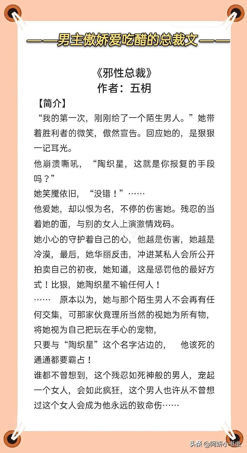 男主傲娇爱吃醋的总裁文!冷酷腹黑霸道是对他人,对女主那就是深情傲娇,还是醋缸,真是强秒男神,后一秒醋王!问题是还是个宠妻无度的。特别是《总裁每天求抱抱》男主好可爱,有点反差萌喜欢对女主撒娇,正如名字所说,真的是天天求抱抱咯>3<行文角度很新颖,几本男主女主都超爱的,文苏苏爽爽到不行,反正很甜!强烈推荐奥!