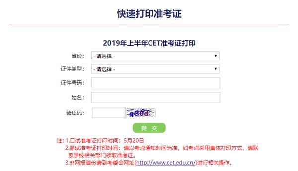 2019年6月英语六级准考证打印入口:以考试所在学校通知为准,采用个人打印方式领取准考证的考生,请于学校通知的开始打印时间后登录网站(http://cet-bm.neea.edu.cn/),用报名时的用户名和密码进入个人账户中打印,也可直接点击主页面中“快速打印准考证”进行打印。