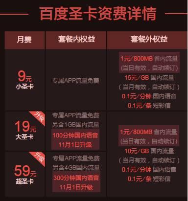 百度圣卡有小圣卡、大圣卡、超圣卡三种可选,最低月费9元起,可以享受手机百度/爱奇艺/百度地图/百度贴吧等14款App专属流量免费;套餐外流量则是1元/500MB。